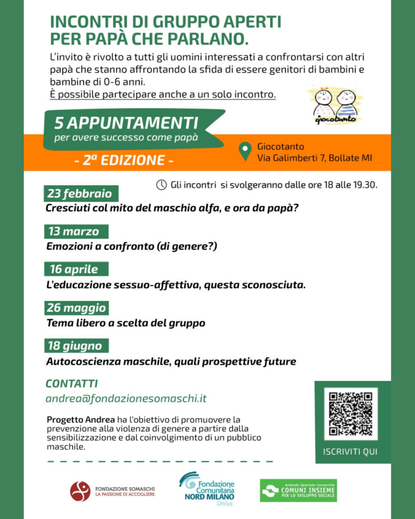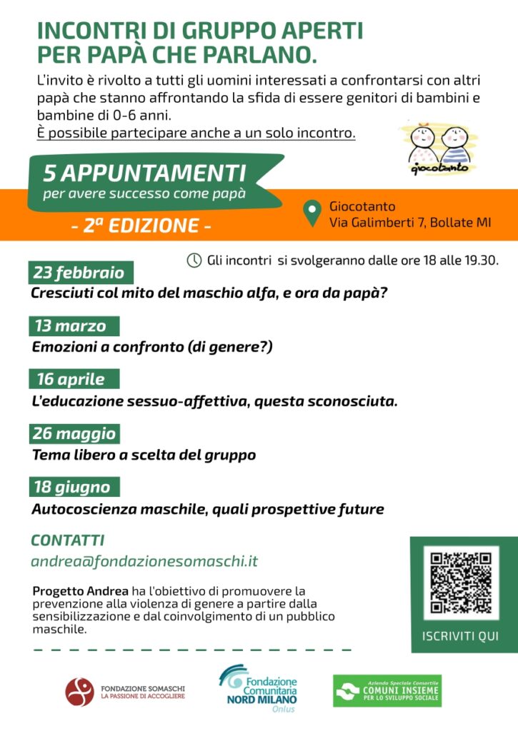 Ripartono gli incontri dedicati del progetto Andrea, una serie di serate rivolte a uomini che hanno voglia di parlare e di raccontarsi insieme ad altri papà che stanno affrontando la sfida di essere genitori.
